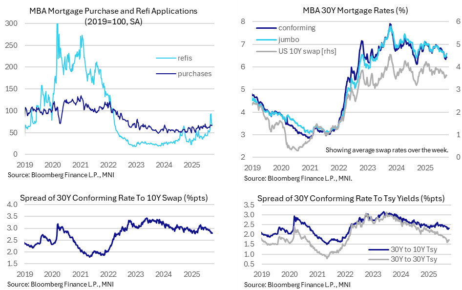 Interestingly, the 30Y mortgage to 10Y Tsy yield spread continues to hover marginally above 230bp having eased modestly since US Tsy Sec Bessent in August talked on wanting to keep the spread between mortgage rates and treasuries flat or even bring it down. These are some of the lowest spreads since Mar 2022.