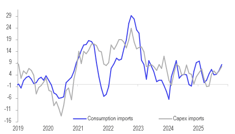 The October merchandise trade surplus widened to $4.385bn after a downwardly-revised $3.71bn but it remains in the range it has been in since the start of 2024. The move was driven by monthly export growth exceeding imports for the second consecutive month and both are showing upward momentum. Stronger exports add to activity while imports signal that domestic demand is robust. The RBA is likely to be on hold beyond the 9 December decision.