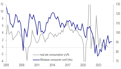 Q3 Westpac consumer confidence moderated to 90.9 from 91.2, remaining well below the series average and firmly in pessimistic territory where it has been for four years. Rate cuts have helped to support it but 250bp of easing has done little to boost sentiment as the labour market remains tough and housing market weak. Confidence is signalling only a soft improvement in real consumption growth currently.