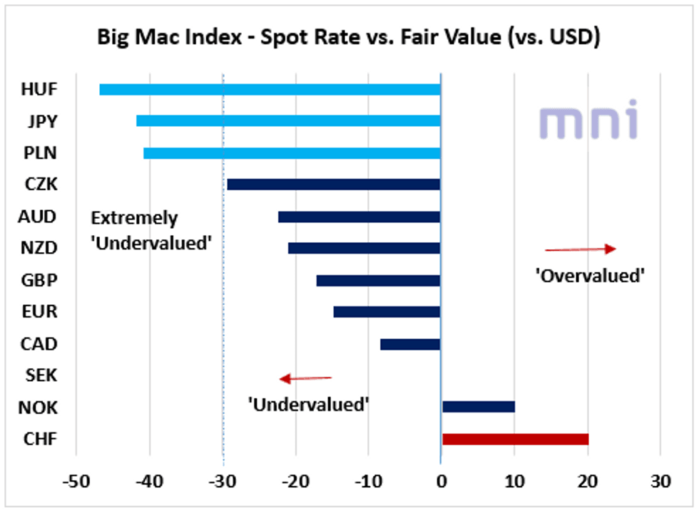 - The chart below ranks the major G9 and CEE currencies based on their percentage difference between the current spot rate and their 'fair' value, using the ‘Big Mac Index’ (BMI) approach (Jan 2022 updates) popularized by the Economist in 1986.