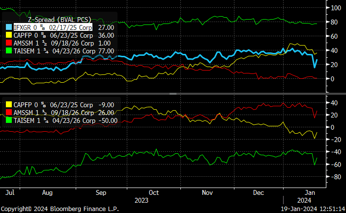 Infineon (IFX GY) credit is on the move after last night’s positive statement from TSMC (2330 TT).