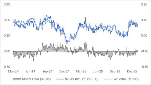 NZGBs are 2-4bps cheaper today, with the NZ–US 10-year yield differential 4bps wider at +29bps.