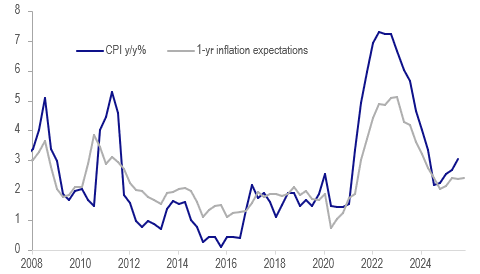 The RBNZ’s Q4 survey of expectations posted unchanged inflation expectations. The central bank is likely to be relieved that not only are they within its 1-3% target band but they didn’t increase in the latest reading following the rise in Q3 CPI to 3.0% y/y from 2.7%, although the RBNZ’s measure of core held steady at 2.7%. The RBNZ has maintained for some time that the Q3 increase would be temporary and its August projections showed inflation moderating from Q4 and approaching the band midpoint in 2026 given the degree of spare capacity in the economy.