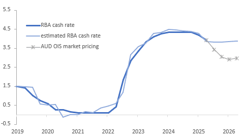 Our policy reaction function is signalling that rates on hold around 3.85% is consistent with the economic outlook. The RBA reduced its trimmed mean inflation projection by 0.1pp to 2.6% so that the inflation gap is now only 0.1pp and also revised down its growth projections due to current global trade uncertainty and slower-than-expected private consumption growth. The model is updated for yesterday’s Q1 GDP data but given much of the softness was due to weather events, a July 8 rate cut is likely to be more dependent on more timely monthly data releases and trade negotiation progress.