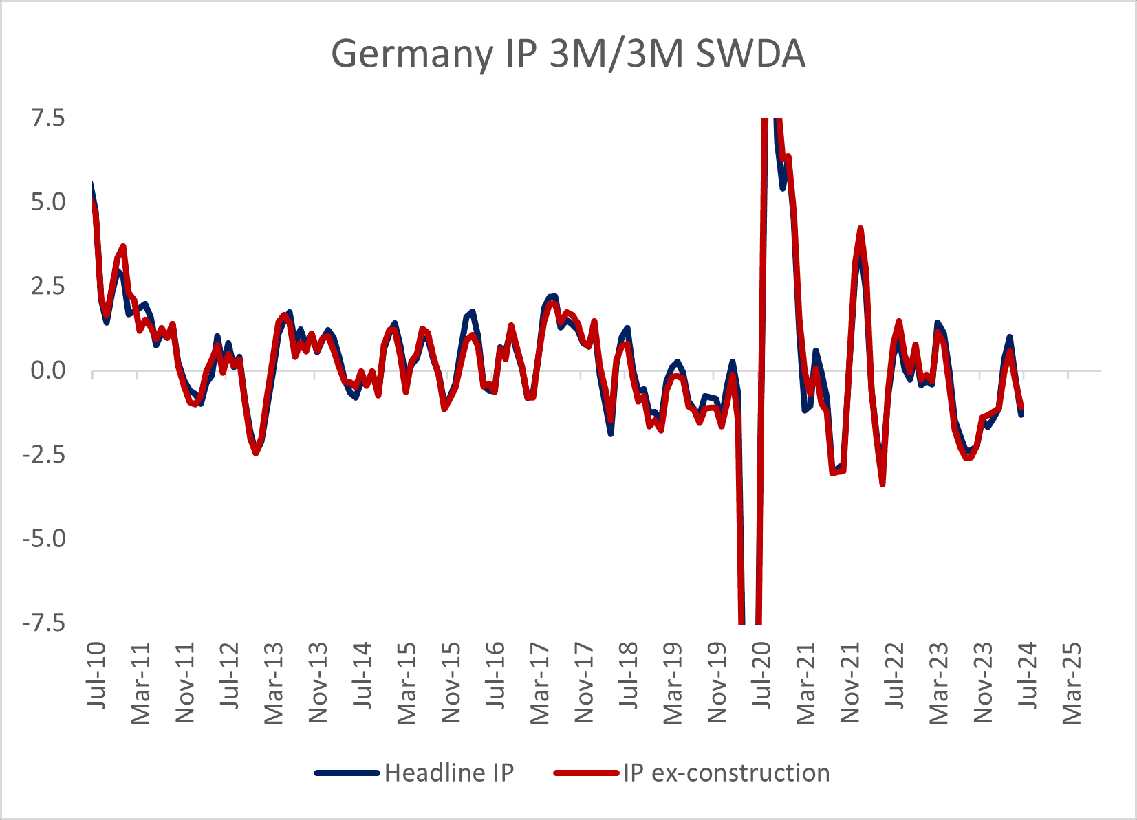 Indeed, the less volatile 3m/3m SWDA IP reading deepened further into negative territory at -1.3% non-annualized in June vs -0.2% in May, reversing the nascent recovery that had been seen in the metric between December 2023 and April 2024 which had seen quarterly growth of 0.4% in Q1.