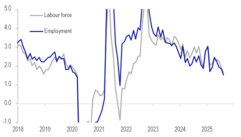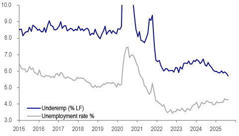 Australia’s monthly labour market data are volatile and August seemed to unwind July’s moves. Looking through this, annual employment growth was its lowest since the pandemic but the unemployment rate held steady at 4.2% and underemployment continued to trend down to its lowest since 1991. RBA Governor Bullock focussed on the Q2 average unemployment rate given the data’s volatility and that is likely to remain the case. September prints on 16 October.