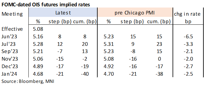 Light option volumes was due to most of Europe out for May-Day bank holiday Monday. Early SOFR Call structure buying ebbed in the second half while Jun'23 SOFR options saw a pick-up in limited downside put condors as a jump over 50.0 to 53.2 in April ISM Mfg PMI data, underscoring a likely 25bp rate hike this Wednesday.