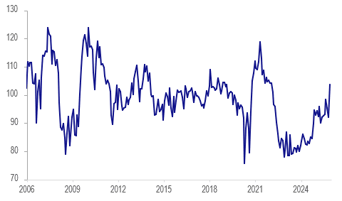 Despite lower rate cut and higher inflation expectations, Westpac consumer confidence surprisingly jumped 12.8% m/m to 103.8 in November, the highest since January 2022 and the largest monthly rise since Covid-impacted September 2020. Finally optimists exceeded pessimists, reflected in the “time to buy a major item” rising almost 15%. If sustained, then it is likely to reflect further recovery in the domestic economy and possibly a wealth effect from rising house prices.
