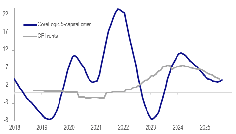 Australia home values vs rents y/y%