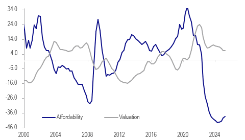 Australia housing affordability vs valuation % deviation from trend