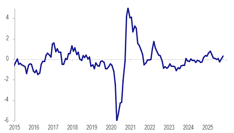The Westpac leading index rose 0.11% in October up from -0.01% bringing the 6-month annualised rate to 0.35% from 0.1%. The increase was due to stronger consumer confidence. The 6-month rate leads detrended growth by 3-9 months and so is consistent with the recovery gaining into H1 2026. The index had been around neutral since April, when the US announced reciprocal tariffs.