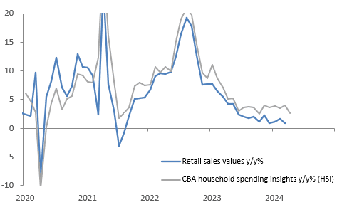 CBA’s household spending indicator (HSI) based on digital transactions fell 1% m/m in April to be up 2.6% y/y down from 3.9% y/y but only +1.4% y/y per person. March retail sales fell 0.4% m/m to be up only 0.8% y/y and the April CBA data suggest this is likely to moderate further given the high correlation between the two series (April retail sales due May 28). Consumption is expected to remain soft and then begin to recover in H2 2024 as tax cuts and lower inflation drive an improvement in real incomes.