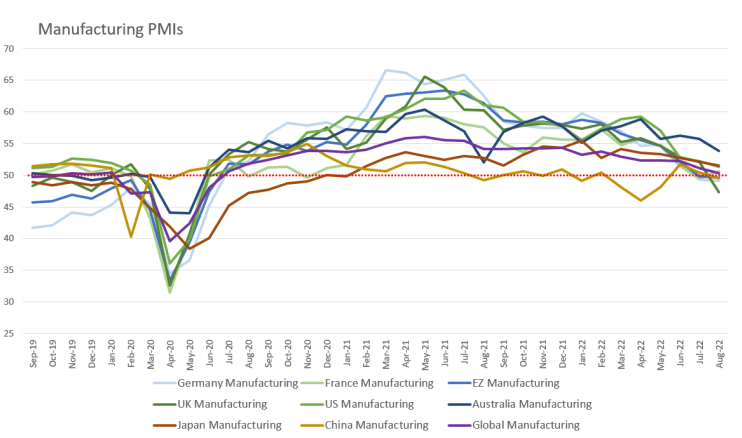 - Firms are pricing in slow demand into the year end as global inflationary pressures chip at consumer spending. New orders saw a sharp fall due to waning demand across the Eurozone, UK, US and Japan, whilst remaining robust in Australia.