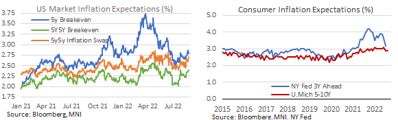 - The release should add some support that surveyed measures of inflation expectations have stabilised/dipped but it comes against market-based measures seeing a notable drift higher since mid-July with both the 5Y breakeven and 5Y5Y measures up some 20-30bps from early July levels at 2.79% and 2.40% respectively, having previously fallen to pre-taper levels.