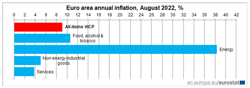 EUROZONE AUG FLASH CPI +9.1% Y/Y (FCST +9.0%); JUL +8.9% Y/Y