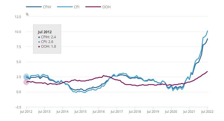 Inflation continued to outpace expectations in July, with the consumer price index (CPI) rising 10.1% year-on-year to a fresh 40-year high, up from 9.4% in June. The rate exceeded analysts consensus forecasts of an increase of 9.8% y/y and was above the Bank of England's outlook for July.