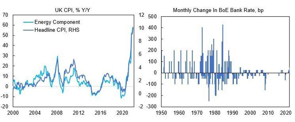 - The BoE's approach to reining in inflation has been relatively timid so far with bank rate adjustments more reminiscent of the 'great moderation' period, rather than the high inflation period of the 1970s and 1980s, which the current inflation readings more closely resemble. The BoE will need to make a judgement call on whether economic headwinds will be sufficient to override the supply-side shock. If not, the central bank could find itself upping the ante again with further 50bp+ rate hikes going into an economic downturn.
