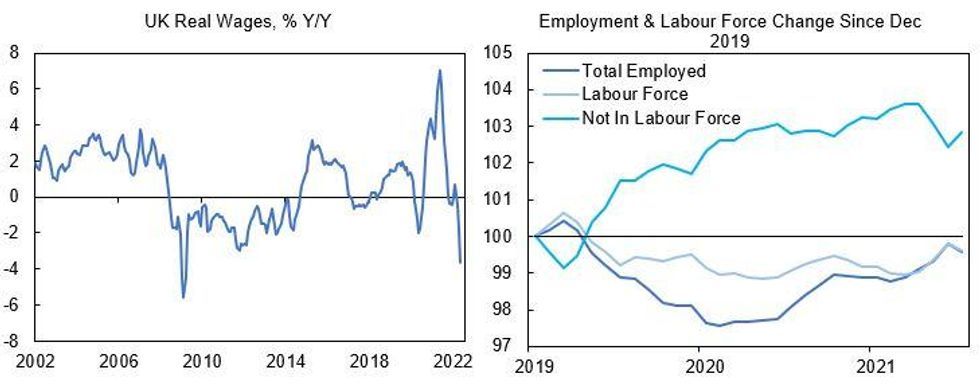 - Even with the labour market still tightening, concerns about the economic outlook are being well-telegraphed (not least by the BoE's own particularly gloomy assessment at the August MPC meeting) and could work against wage negotiations when job security starts to trump maintaining purchasing power.