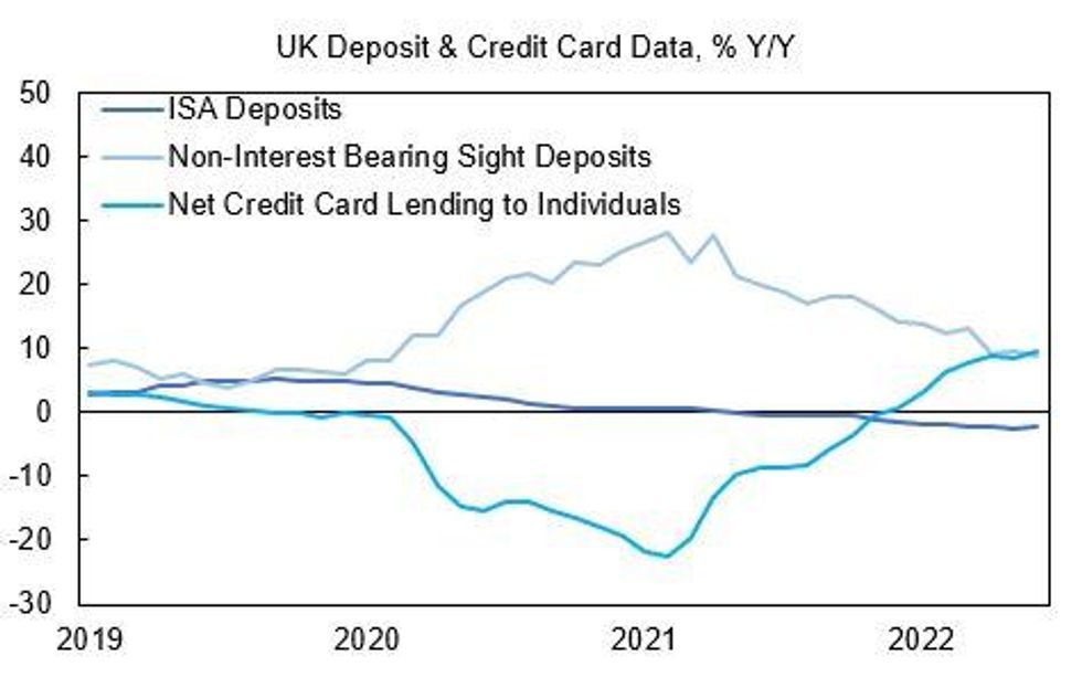 - In the chart below we look at the Y/Y growth in ISA deposits and non-interest bearing sight deposits, with the former being a tax-free savings vehicle and a proxy for long-term saving, while the latter serves as a proxy for liquid cash balances.