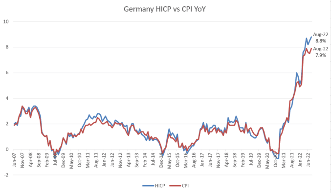GERMANY AUG FLASH HICP +8.8% Y/Y (FCST +8.8%); JUL +8.5% Y/Y
