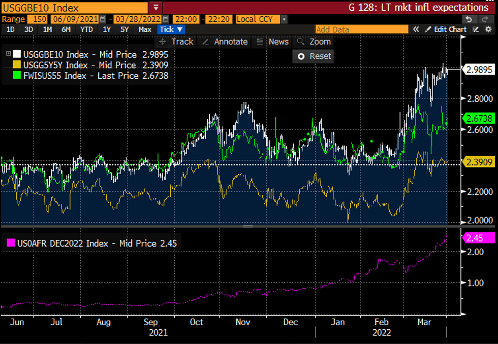 US 10Y breakeven (white), 5Y5Y breakeven (yellow), 5Y5Y inflation swap (green) and Fed Funds Dec'22 FOMC implied rateSource: Bloomberg