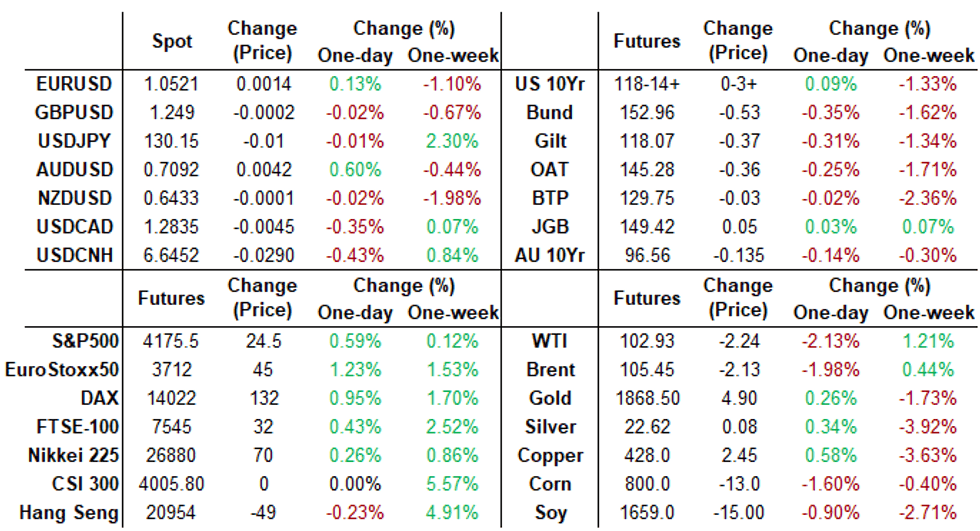 US Rates traded mixed Tuesday, futures rebounded from the week opener's broad based sell-off, curves bull flattening (2s10s -4.060 at 20.487) as long end rates outperformed in the lead-up to Wednesday's FOMC policy annc at 1400ET (Chairman Powell presser at 1430ET).