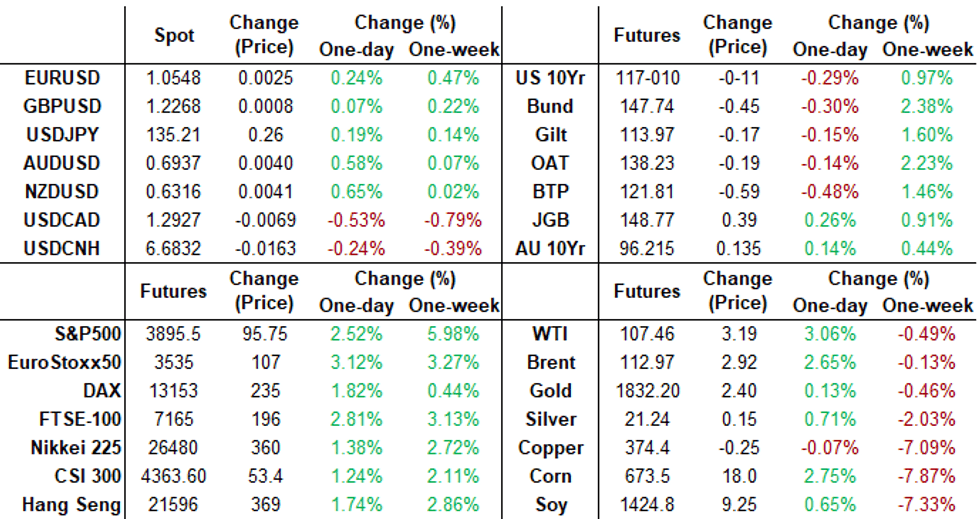 US rates trade sideways through the second half, finishing near session lows, yield curves steeper with short end outperforming. Early risk-on tone gained momentum in late morning trade as stocks climbed to two-week highs: SPX eminis back to June 13 levels, ESU2 currently at 3899.0 (+99.25) vs. post FOMC low of 3649.00. DJIA +718 (2.34%) at 31397.09; Nasdaq +303 (2.7%) at 11536.68.
