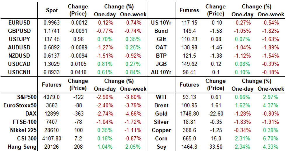 Stocks continue to extend session lows in late trade, SPX eminis just through 50DMA of 4089.67. Double-tap of hawkish policy headlines from the ECB contemplating a 75bp move next month underscoring Fed Chairman Powell higher rates for longer/restrictive stance took air out of early bid/triggered sell-off in early trade. Potential DOJ antitrust suit vs. Apple weighing on Tech and Communication Services share late in the session.