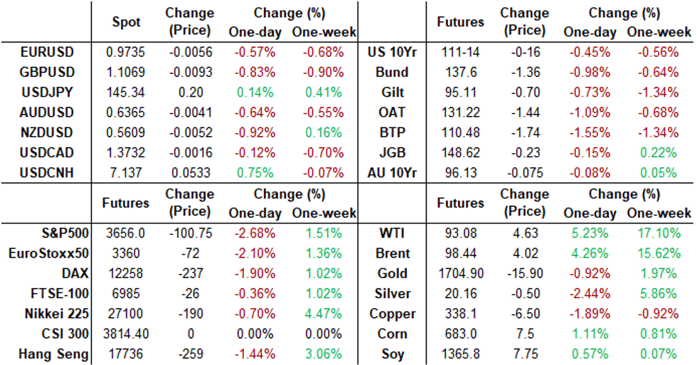 Stock indexes gradually extending losses in late trade, early support sapped after better than expected Sep NFP data underscored Fed's likely hawkish forward policy path. Information Technology, Consumer Discretionary and Communication Services underperforming. Currently, SPX eminis trade -106 (-2.82%) at 3650.5; DJIA -664.75 (-2.22%) at 29261.17; Nasdaq -407.9 (-3.7%) at 10665.29.
