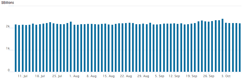 NY Fed reverse repo usage recedes to $2,226.950B w/ 101 counterparties vs. $2,232.801B in the prior session. Recent record high stands at $2,425.910B on Friday, September 30.