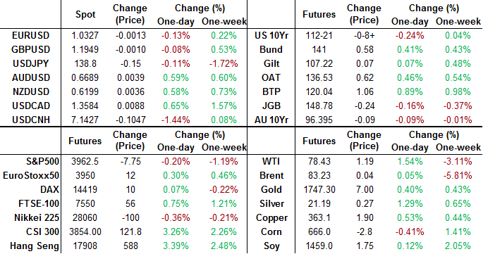 - UK: The 2-Yr yield is down 3.4bps at 3.253%, 5-Yr is down 4.4bps at 3.224%, 10-Yr is down 2.6bps at 3.1%, and 30-Yr is down 0.4bps at 3.358%.