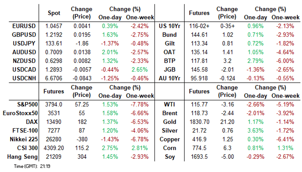 BOE (MNI): A 25bp hike is fully priced forthis week's MPC meeting, with markets pricing in around a 1/3 probability that the Bank of England vote for a larger 50bp hike. We think that there is likely to be enough support for most (or "the majority") of members to continue with the previous forward guidance for this month at least. Full MNI BOE Preview here: https://marketnews.com/markets/central-bank-reports/central-bank-preview/bank-of-england-preview/mni-boe-preview-june-2022-25bp-but-what-next