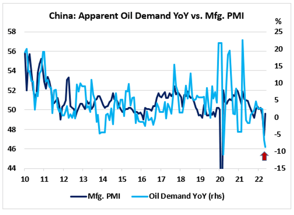 The chart below shows that a plunge in apparent oil demand (YoY) has generally been associated with a sharp contraction in China manufacturing PMI.
