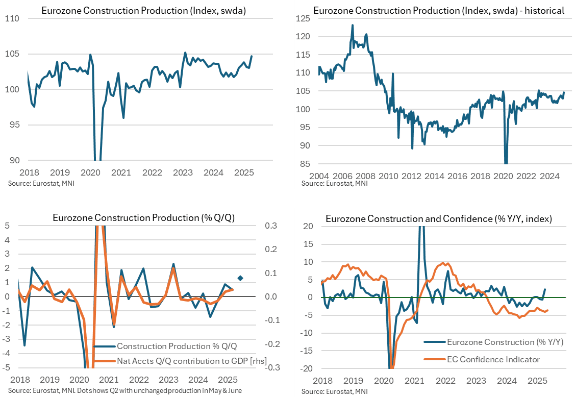 Eurozone construction production increased a particularly strong 1.7% M/M in April (swda) for its strongest monthly increase since Feb 2023.
