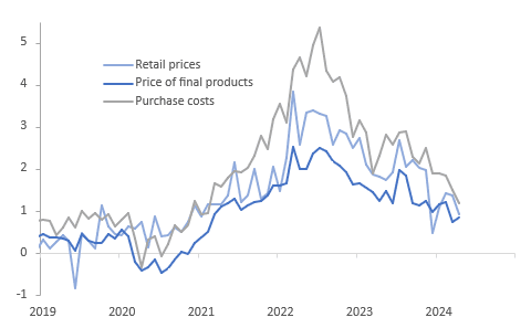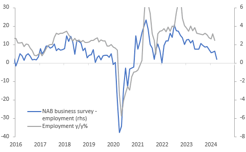 NAB’s measure of business confidence was stable at 1 in April but conditions eased further to 7 from 9, only slightly above the series average. Confidence has been fairly steady around 1 through 2024 but conditions have eased 3 points since December and 18 points since the September 2022 peak. The main activity components eased further with employment now below the historical average, while April price/cost components moderated compared with Q1.
