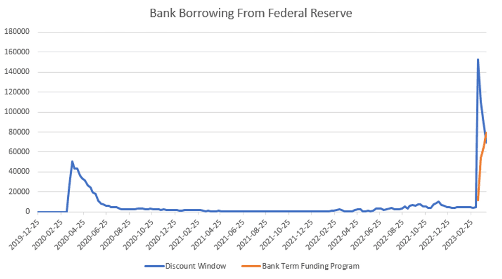 Bank borrowing from the Fed as of yesterday--through either the discount window or the Bank Term Funding Program (BTFP)--was USD149 billion, down USD4 billion from the prior Wednesday. The previous week to March 29 saw a USD11 billion decline. The discount window saw USD70 billion in usage, down from USD88 last week, while the Bank Term Funding Program saw USD80 billion, up from USD64 billion last week. Analysts have expected discount window borrowing to shift into the more favorable terms of the BTFP.