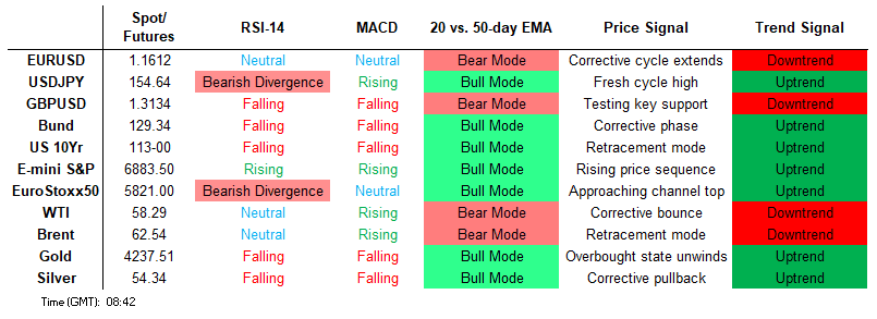 The trend structure in USDJPY remains bullish and this week’s extension reinforces current conditions. Wednesday’s climb delivered a print above 154.48, the Nov 4 high and a bull trigger. The break confirms a resumption of the uptrend and maintains the price sequence of higher highs and higher lows. Sights are on 155.53, a Fibonacci projection. Initial support to watch lies at 153.03, the 20-day EMA.