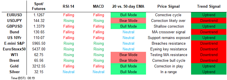EURUSD continues to trade above last week’s low and recent weakness appears corrective. A key support at the 50-day EMA, at 1.1102, remains intact. A clean break of this average would undermine the uptrend and highlight a stronger reversal. Key trend signals still highlight an uptrend. A key resistance to watch is 1.1381, the May 2 - 6 high. Clearance of this level would signal the end of the correction and highlight a bullish break.