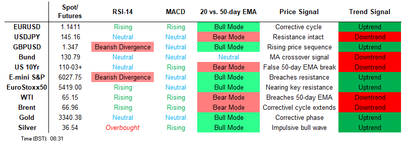 A bullish theme in Gold remains intact and the latest pullback appears corrective. Medium-term trend signals remain bullish - moving average studies are in a bull-mode position, highlighting a dominant uptrend. A resumption of gains would refocus attention on $3435.6 next, the May 7 high. A break of this hurdle would strengthen bullish conditions. On the downside, the next support to monitor is $3245.6, the 50-day EMA.