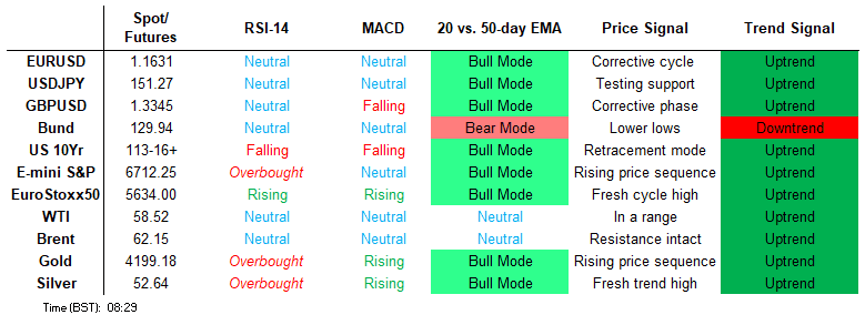 A sharp sell-off in S&P E-Minis last Friday appears corrective - for now. The contract has found support below the 50-day EMA, currently at 6605.62, and the Oct 10 low of 6540.25 has been defined as a key short-term support. Moving average studies are in a bull-mode position, highlighting a dominant uptrend. The bull trigger is 6812.25, the Sep 9 high. A breach of this hurdle would confirm a resumption of the uptrend.