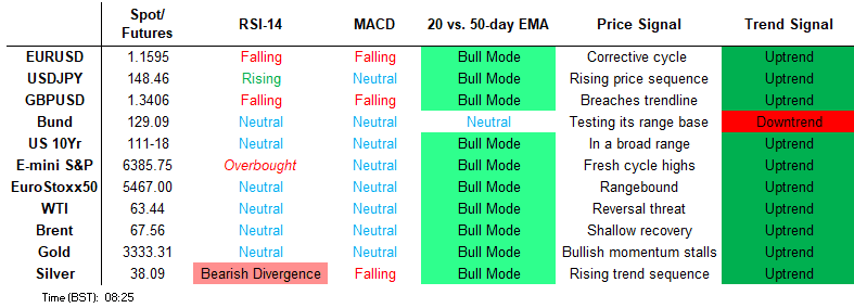 The dominant uptrend in S&P E-Minis remains intact and the latest retracement appears to be a correction - for now. Moving average studies are in a bull-mode position, highlighting a clear uptrend and positive market sentiment. A resumption of gains would pave the way for a climb towards 6523.63, a Fibonacci projection. On the downside, support to watch lies at 6291.07, the 50-day EMA.