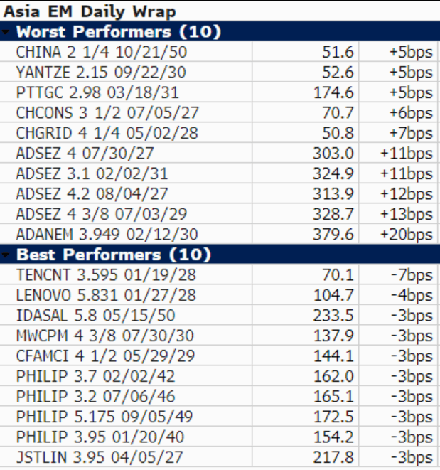 U.S. 10y treasury yields are around 2bp higher in Asia hours at 4.3%, with the possibility that a U.S. government shutdown may be subsiding. In Asia, EM was mostly better on the day, with govie/agency bonds 2-3bp tighter, an exception being India where the $ 1/33s EXIMBK bond is around 2bp wider. In the Indian corporate space, news that Adani legal woes may be returning has put pressure on Adani group company bond spreads (10-20bp wider) - the main underperformer today.