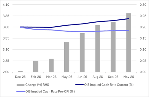 Today’s move extends the recent firming in rate expectations, which began after the stronger-than-expected Monthly CPI on 26 November, to 5–26bps across the curve, led by December 2026.