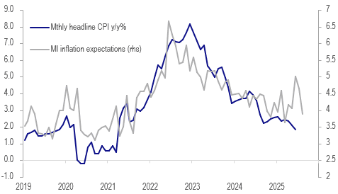 AU Data: Inflation Expectations Back Below 4%In June, Melbourne Institute consumer inflation expectations jumped 1pp to 5%. They moderated to 4.7% in July and in August to 3.9%, the first print below 4% since March's 3.6%. Looking at the trend, the series has been moving sideways for around the last year. It is still too soon to say that inflation expectations are drifting down again with the next few months key in determining that.