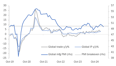 The global aggregate of the S&P Global PMI showed a marked deterioration in April as uncertainty soared from US tariff announcements, delay and China’s retaliation. Overall global economic activity remained slightly positive in the month with the composite PMI at 50.8 (March 52.1) but the manufacturing sector shifted slightly into contractionary territory with the PMI down to 49.8 from 50.3 in March and 50.6 in February. This implies that we could see global IP growth turn down in coming months.