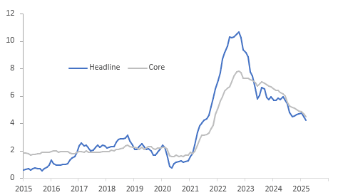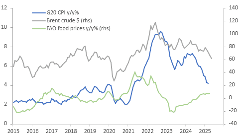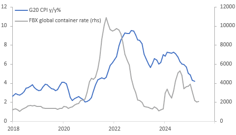 Global headline inflation is now less than half its late 2022 peaks, which was boosted by Covid-related supply-chain bottlenecks. There are concerns that recent global trade policy developments will create these issues, especially for the US because of its 145% duty on imports from China. Talks begin this week between the two but de-escalation will be the first step.