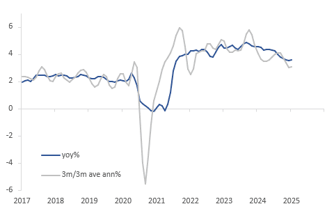 January SEEK advertised salary data is showing a gradual pick up in wages offered in line with the labour market tightening “a little further in late 2024”, as the RBA stated in its February meeting statement. Advertised wages rose 0.3% m/m last month to be up 3.6% y/y, the third straight month at this annual rate signalling stabilisation after moderating since the September 2023 peak. The monthly increase has been gradually rising since it troughed at 0.23% m/m in October.