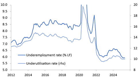 The underemployment rate fell 0.1pp to 5.9% after it rose to 6% in April. It has been steady around 5.9% since December, while underutilisation has been around 10% all year and below the 10.5% 2024 average.