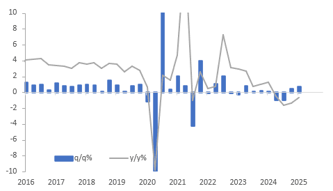 Expenditure GDP rose 0.9% q/q, the fastest since Q2 2023, to be down 0.2% y/y after -1.1% in Q4. Growth in Q1 was fairly broad-based and substantially above the RBNZ’s May forecast. While it is backwards-looking data, it may allow the central bank to pause in July, especially given the pickup in inflation.