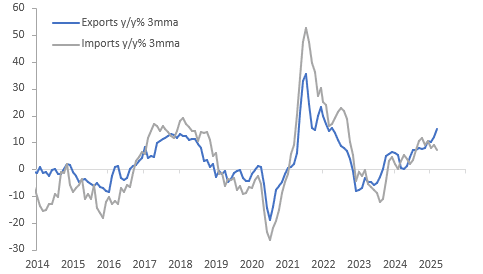 Q1 customs export growth picked up to 15.1% y/y from 10.5% in Q4, while imports slowed to 7.3% y/y from 10.5%.